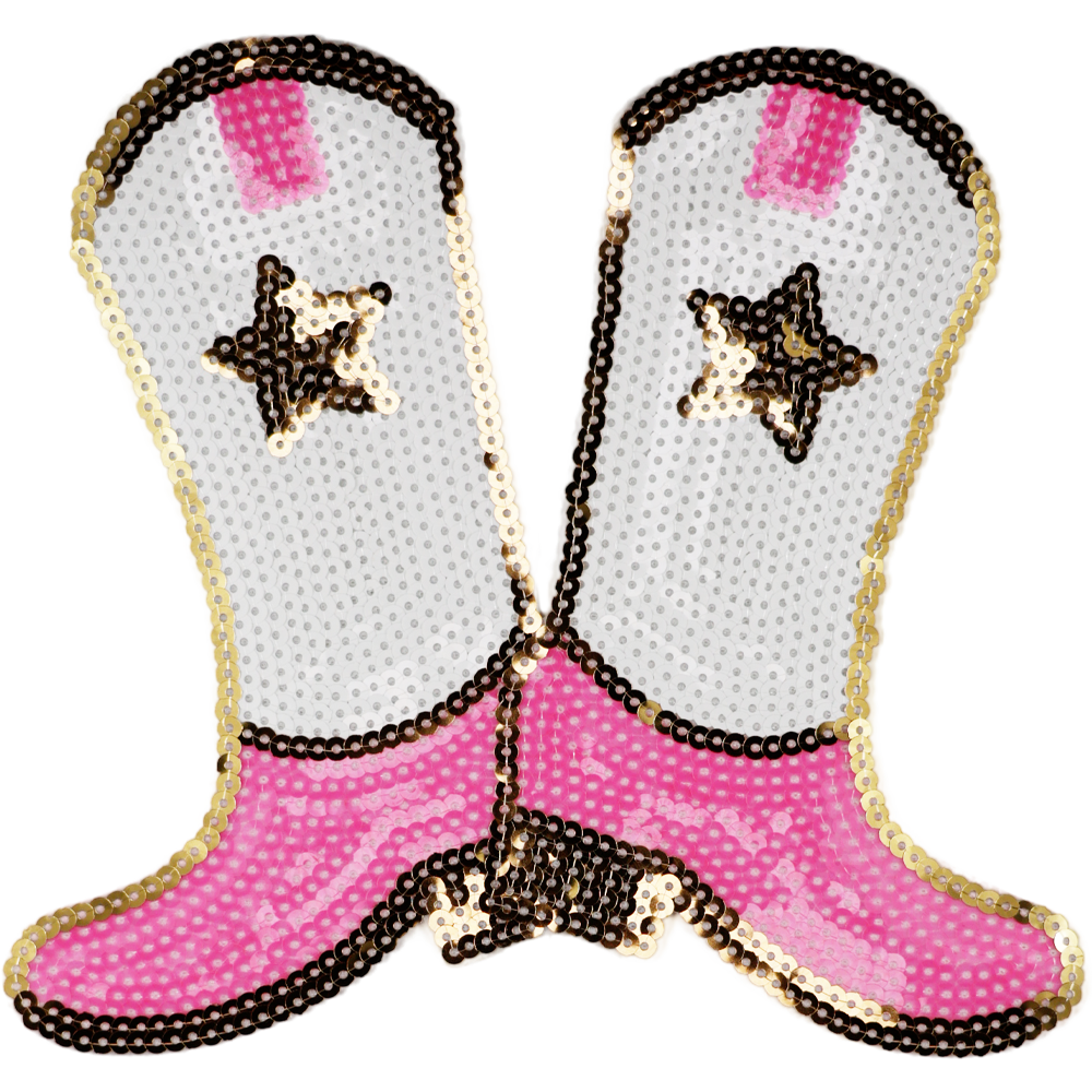 Pink White and Gold Star Sequin Pair of Cowgirl Boots Iron-on Patch